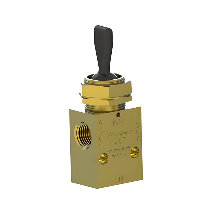 三位、四通微型撥動(dòng)閥、彈簧復(fù)位、帶 1/8 管口。TAC 三位肘節(jié)閥在 5/8-32 螺紋環(huán)上方有一個(gè)杠桿。該功能允許輕松安裝面板。肘節(jié)設(shè)計(jì)可防止閥門超沖程。緊湊的。崎嶇。